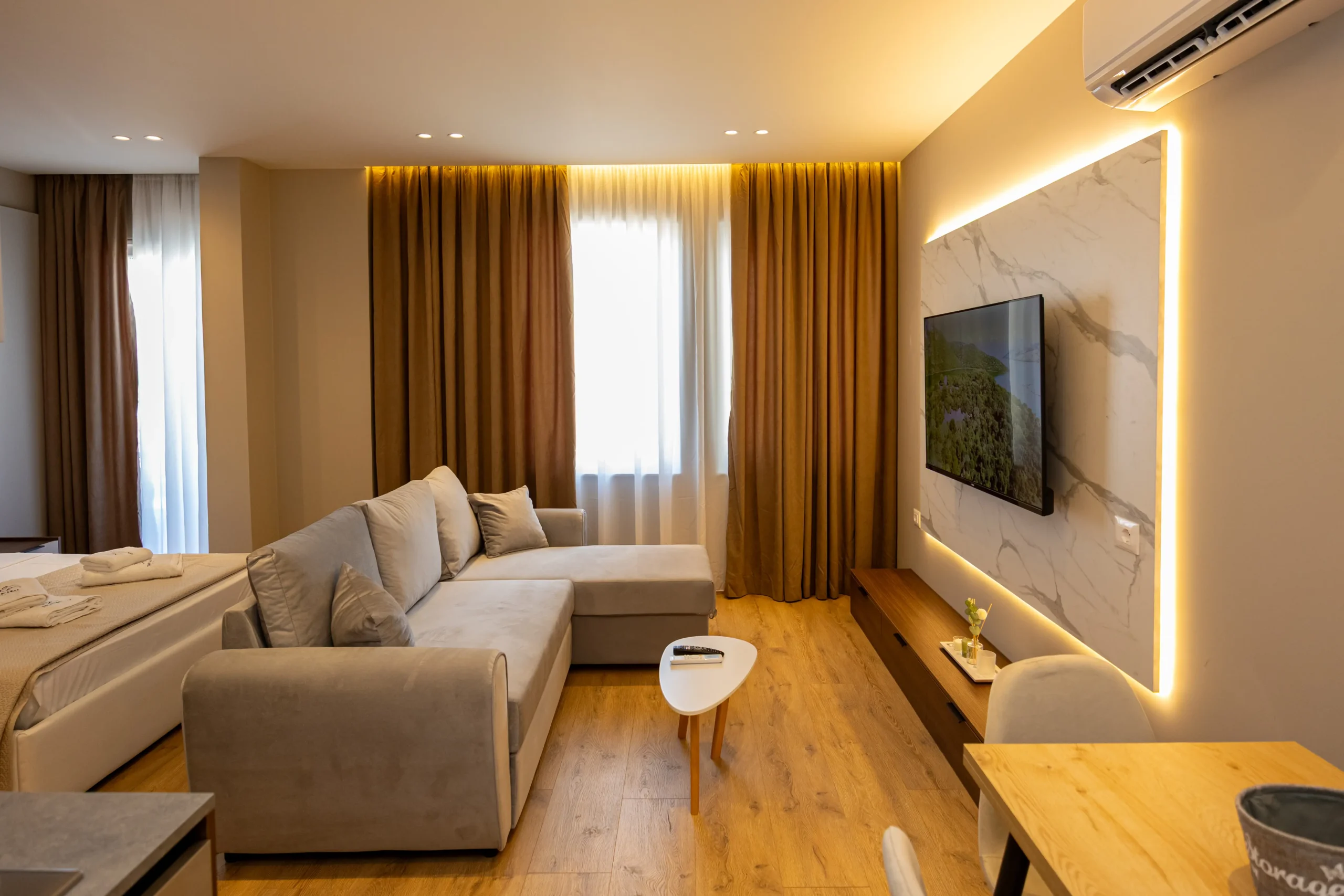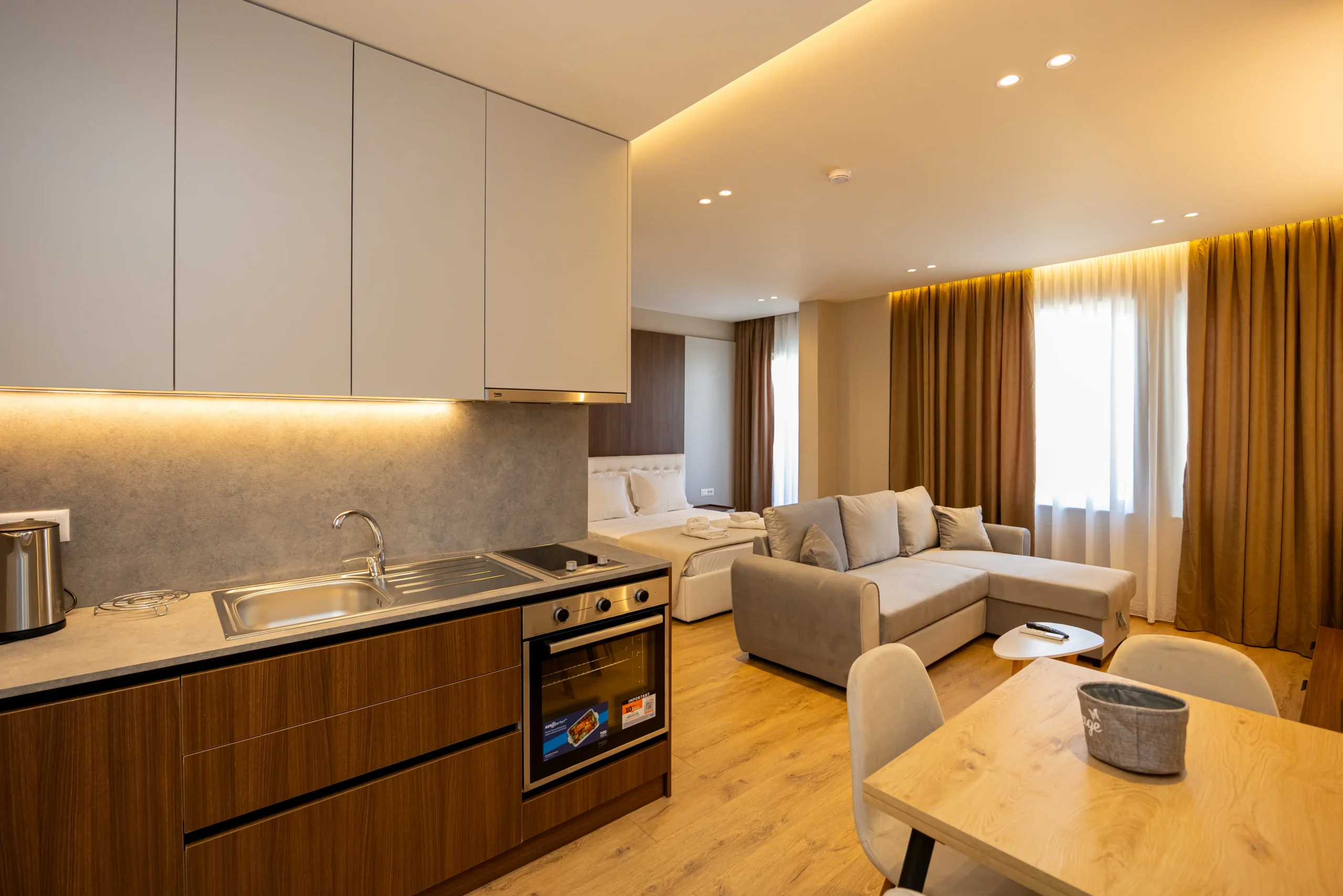 A charming small apartment with a western orientation, designed for comfort and practicality. It includes a welcoming living room, a fully equipped kitchen, a cozy bedroom, a modern bathroom, and a balcony offering relaxing city views ideal for a peaceful stay in the heart of Tirana.